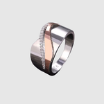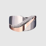 Tento prsten kombinuje stříbrnou a růžově zlatou barvu pro elegantní kontrast. Jemný řetěz krystalů dodává vytříbený lesk, aniž by byl vtíravý.