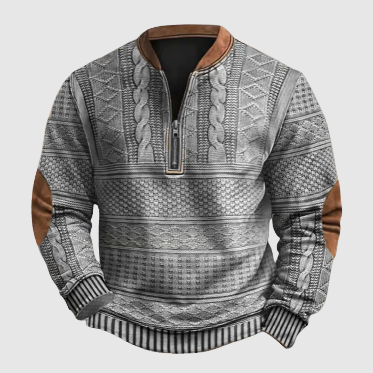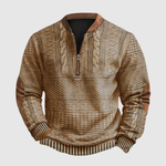 Teplý a charakteristický svetr s decentním vzorem a praktickým polozapínáním u krku.