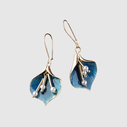 Tyto elegantní náušnice kombinují jemný zlatý rám, ručně nanesenou modrou emailovou barvu a delikátní perly, které zdůrazňují přirozenou krásu. Jsou vhodné jak na každodenní nošení, tak na speciální příležitosti.