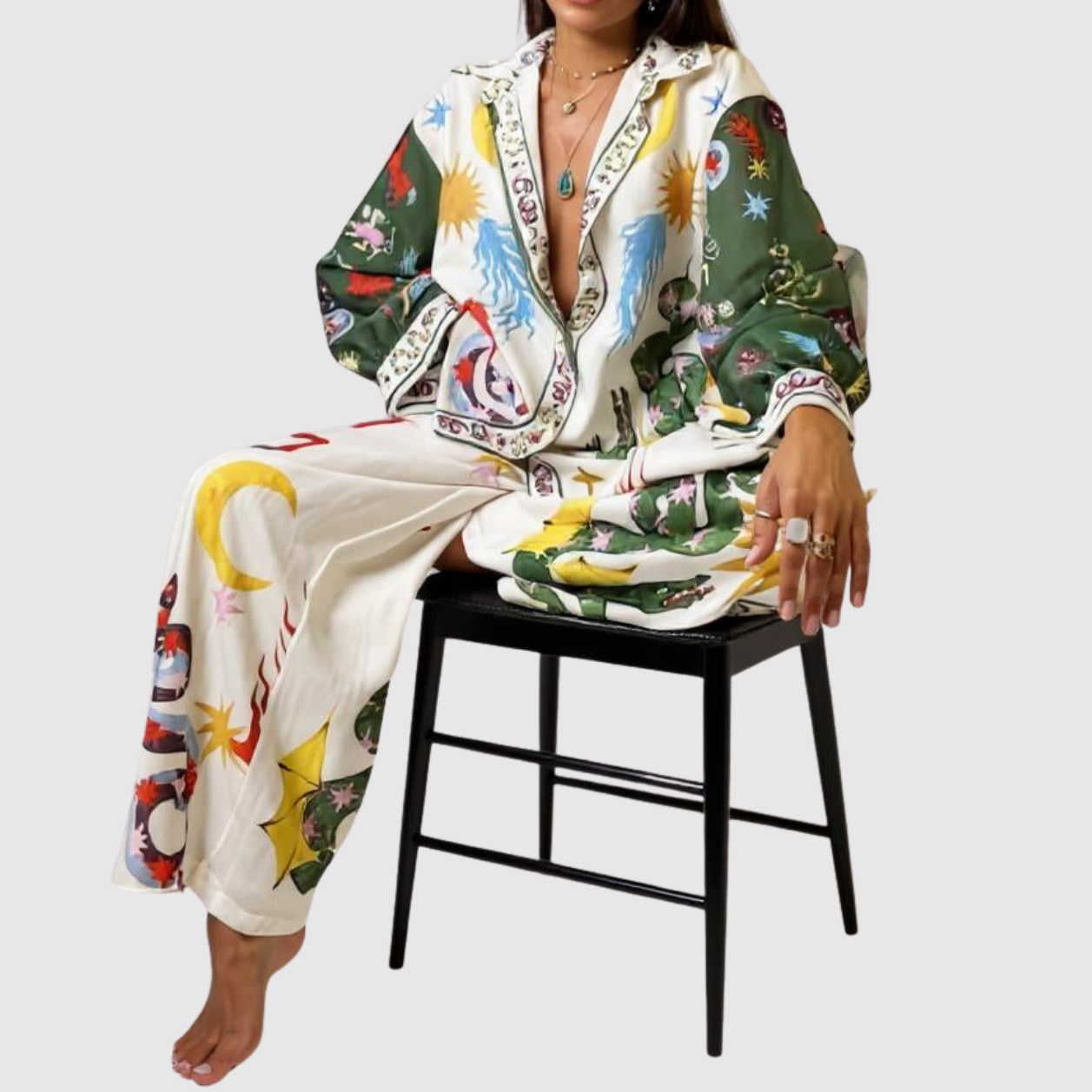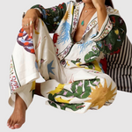 Tato kombinéza kombinuje malebné vzory s elegantním siluetou, což z ní činí jedinečné prohlášení. Vyrobena z lehkého a pohodlného materiálu, nabízí jak styl, tak svobodu pohybu. Ideální pro ty, kteří chtějí vyniknout elegancí.